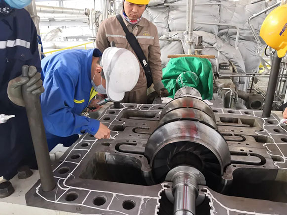 為保證現(xiàn)場服務(wù)工作的質(zhì)量,沈鼓服務(wù)人用踏踏實(shí)實(shí)的工作作風(fēng)、實(shí)實(shí)在在的服務(wù)成果來詮釋。從機(jī)組到貨開箱驗(yàn)收、機(jī)組就位、拆檢、附屬設(shè)備安裝、調(diào)試、試車、投產(chǎn),環(huán)環(huán)把控不出紕漏,把工作做到實(shí)處,為每一套離心壓縮機(jī)組一次試車成功打下良好基礎(chǔ)。