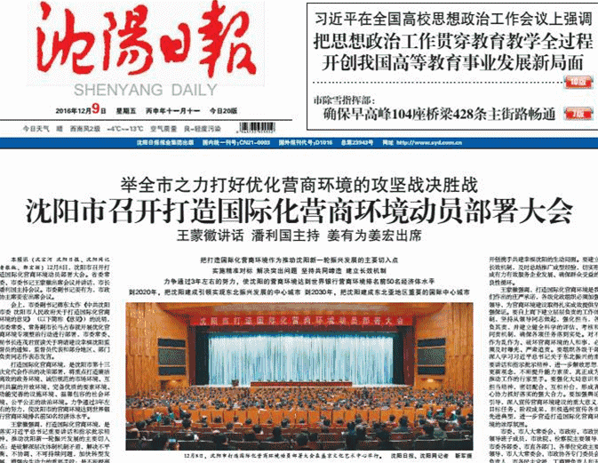 沈陽提出用3年左右時間的努力,力爭使營商環(huán)境達到世界銀行營商環(huán)境排名前50名經(jīng)濟體的水平,進而在2020年將沈陽建成引領(lǐng)實現(xiàn)東北振興發(fā)展的中心城市,到2030年建成東北亞地區(qū)重要的國際中心城市。