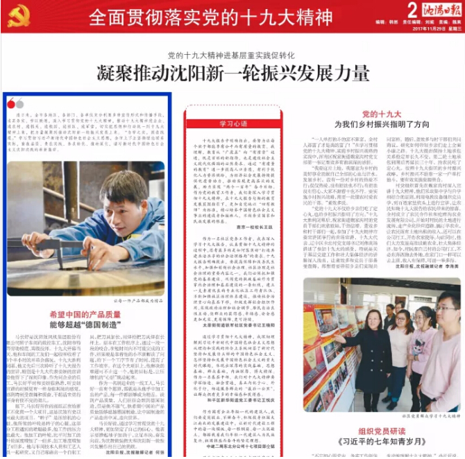 11月29日出版的《沈陽(yáng)日?qǐng)?bào)》”全面貫徹落實(shí)黨的十九大”專欄報(bào)道了連日來(lái)了沈陽(yáng)各界正在全面學(xué)習(xí)宣傳貫徹十九大精神。