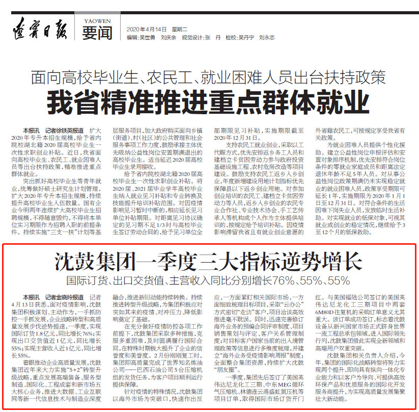 4月14日,《遼寧日報》在要聞版面報道了面對疫情影響,沈鼓集團積極謀劃、主動作為,一手抓防控一手抓發(fā)展,企業(yè)戰(zhàn)略轉(zhuǎn)型和高質(zhì)量發(fā)展步伐逆勢提速,一季度,實現(xiàn)國際訂貨1.8億元,同比增長76%;實現(xiàn)出口交貨值近1億元,同比增長55%;實現(xiàn)主營收入近1億元,同比增長55%——
