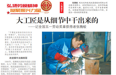 5月5日,《沈陽(yáng)日?qǐng)?bào)》報(bào)道了全國(guó)五一勞動(dòng)獎(jiǎng)?wù)芦@得者、遼寧省勞動(dòng)模范、盛京的工匠、沈鼓集團(tuán)總裝車(chē)間高級(jí)技師張騰蛟十幾年成長(zhǎng)、“蛻變”的故事